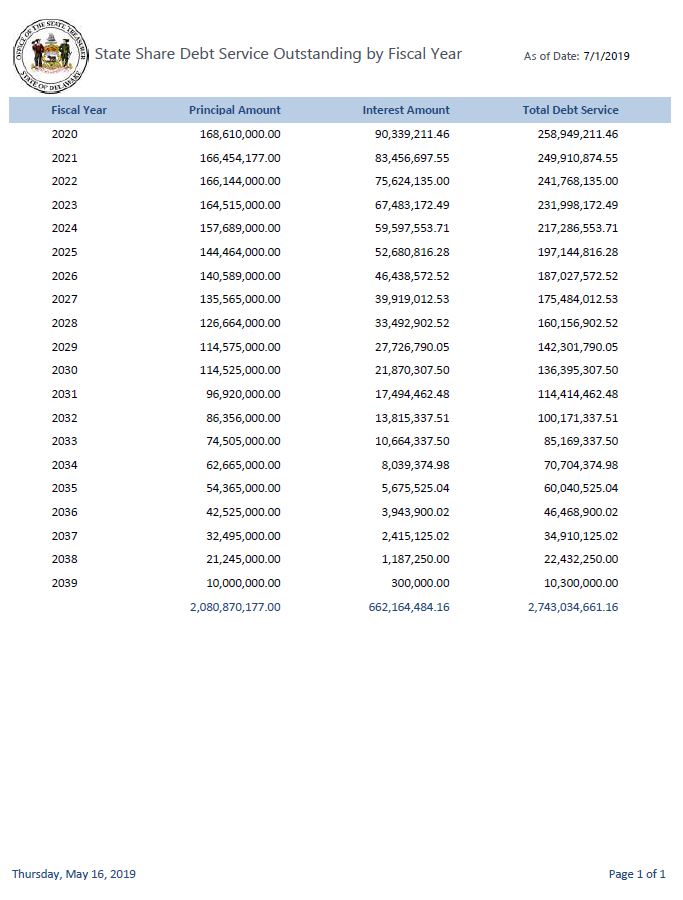 State Share Debt Service Outstanding by Fiscal Year As of Date: 7/1/2019 Fiscal Year Principal Amount Interest Amount Total Debt Service 2020 168,610,000.00 90,339,211.46 258,949,211.46 2021 166,454,177.00 83,456,697.55 249,910,874.55 2022 166,144,000.00 75,624,135.00 241,768,135.00 2023 164,515,000.00 67,483,172.49 231,998,172.49 2024 157,689,000.00 59,597,553.71 217,286,553.71 2025 144,464,000.00 52,680,816.28 197,144,816.28 2026 140,589,000.00 46,438,572.52 187,027,572.52 2027 135,565,000.00 39,919,012.53 175,484,012.53 2028 126,664,000.00 33,492,902.52 160,156,902.52 2029 114,575,000.00 27,726,790.05 142,301,790.05 2030 114,525,000.00 21,870,307.50 136,395,307.50 2031 96,920,000.00 17,494,462.48 114,414,462.48 2032 86,356,000.00 13,815,337.51 100,171,337.51 2033 74,505,000.00 10,664,337.50 85,169,337.50 2034 62,665,000.00 8,039,374.98 70,704,374.98 2035 54,365,000.00 5,675,525.04 60,040,525.04 2036 42,525,000.00 3,943,900.02 46,468,900.02 2037 32,495,000.00 2,415,125.02 34,910,125.02 2038 21,245,000.00 1,187,250.00 22,432,250.00 2039 10,000,000.00 300,000.00 10,300,000.00 2,080,870,177.00 662,164,484.16 2,743,034,661.16 Thursday, May 16, 2019 Page 1 of 1