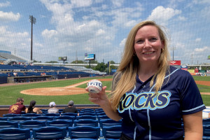 Treasurer Colleen Davis wearing a Wilmington Blue Rocks jersey holding a baseball
