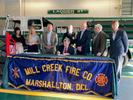 Treasurer Davis watches as Governor Carney signs House Bill 371