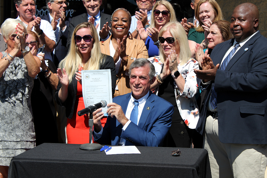 Gov. Carney holding copy of HB 205 after signing